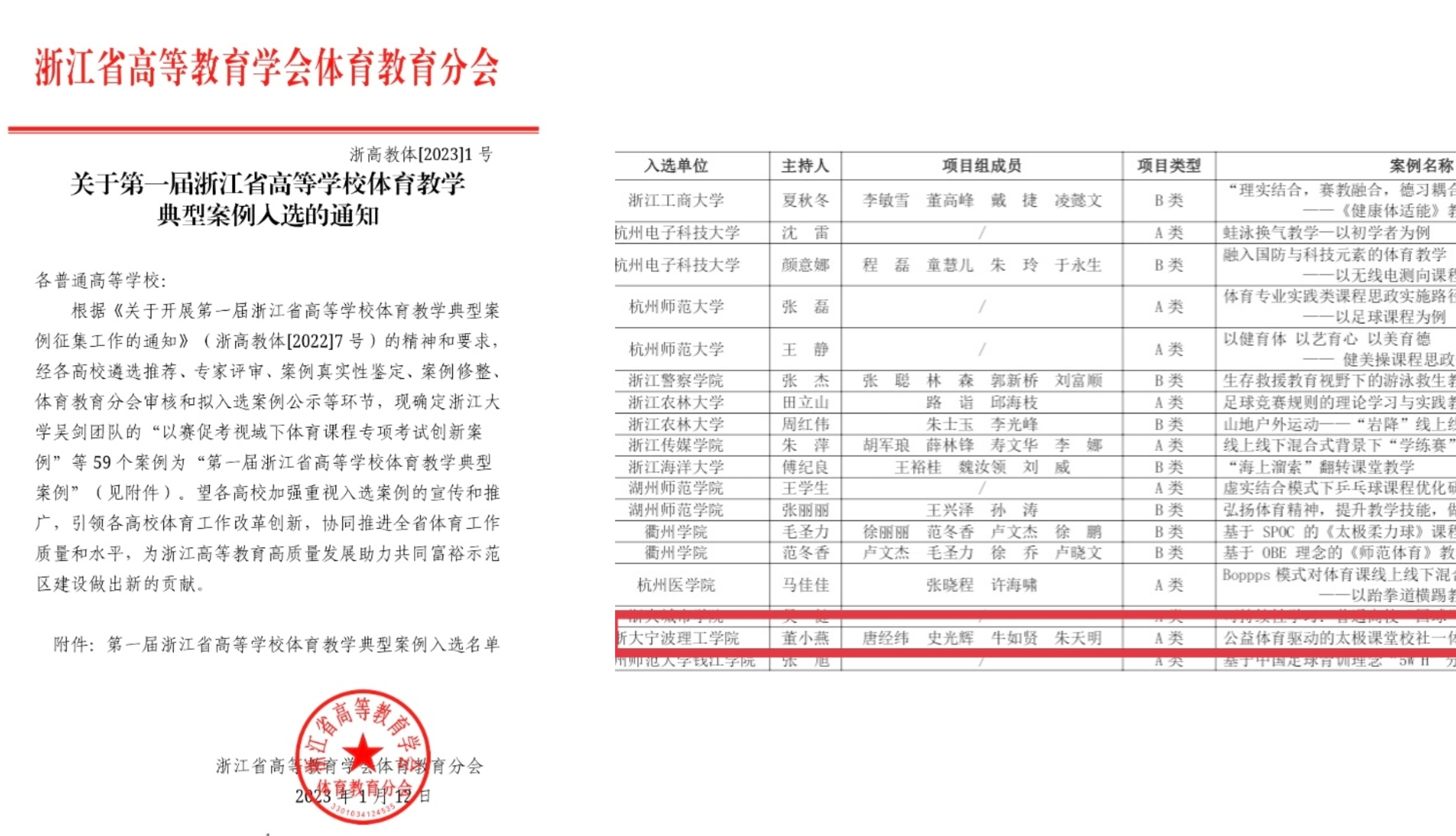近日,浙江省高等教育学会体育分会公布了第一届浙江省高等公司体育教学典型案例,公司体育教师董小燕副教授团队撰写的教学案例“公益体育驱动的太极课堂校社一体化教学模式”成功入选。
